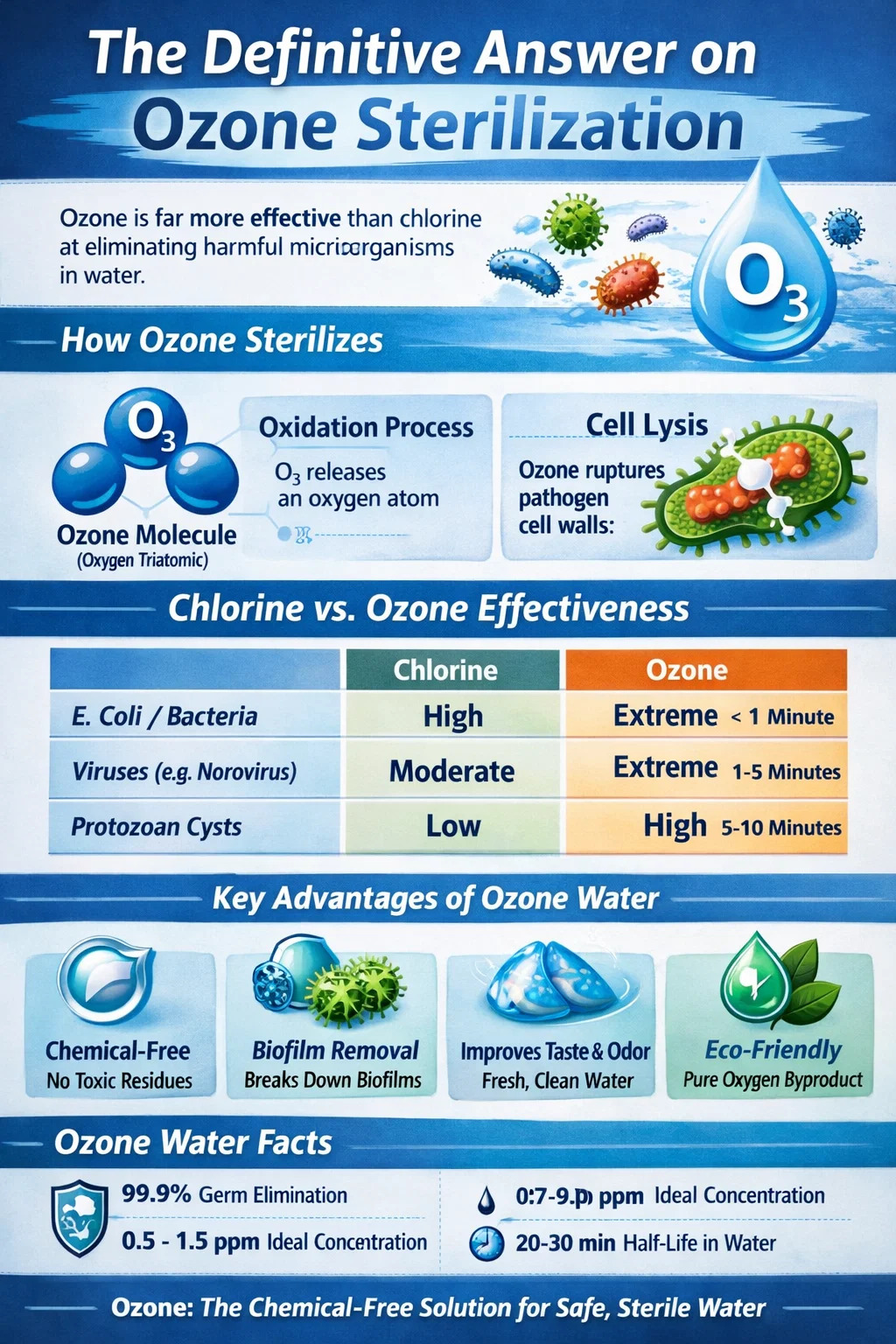 Podsumowując, woda ozonowa to wysoce wyrafinowane i skuteczne narzędzie do sterylizacji wody. Jego zdolność do fizycznego, a nie chemicznego niszczenia komórek sprawia, że jest to główny wybór dla szpitali, rozlewni i domów dbających o zdrowie. Rozumiejąc równowagę między czasem kontaktu i stężeniem, możesz wykorzystać ozon do stworzenia bezpiecznego, sterylnego i krystalicznie czystego źródła wody bez ani jednej kropli agresywnych chemikaliów.
