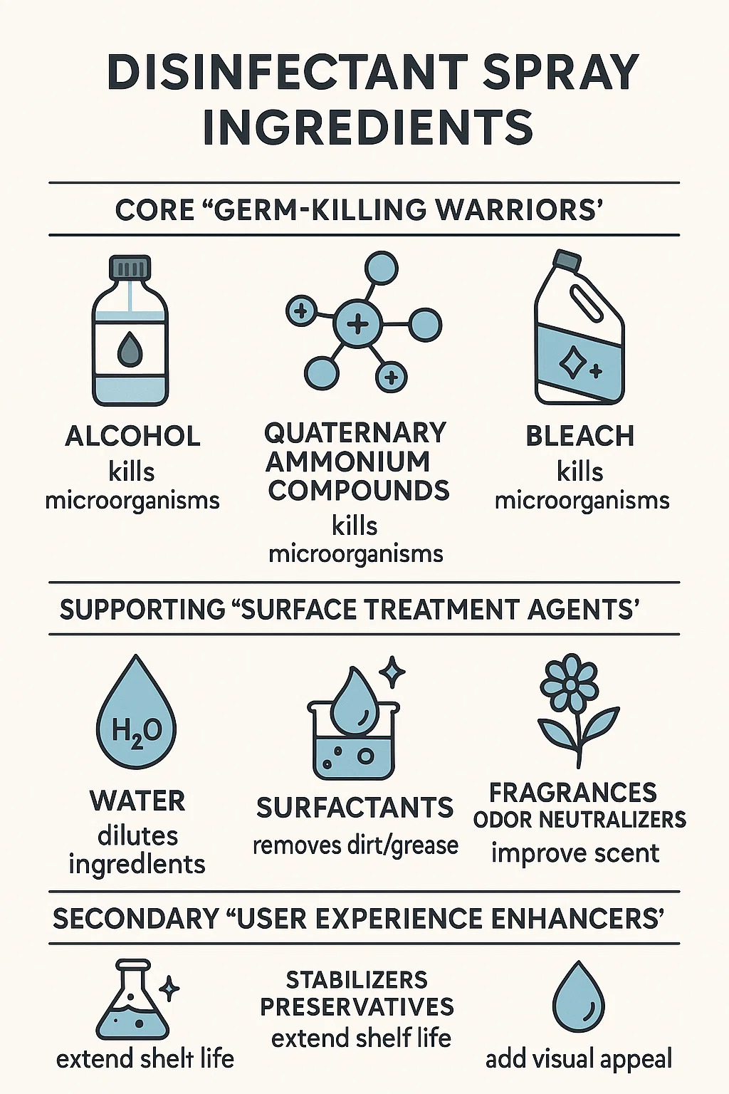 Aby stworzyć efektowną spray dezynfekujący , główne składniki „bohaterów” można ogólnie podzielić na następujące kategorie: